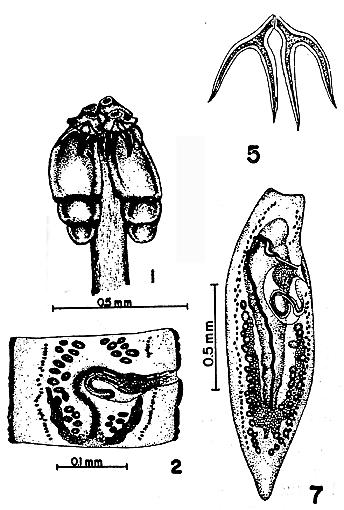 FIGURES 1, 2, 5 & 7. Acanthobothrium coquimbensis n. sp. 1. Scolex. 2. Segmento maduro. 5. Par de ganchos. 7. Segmento grávido.