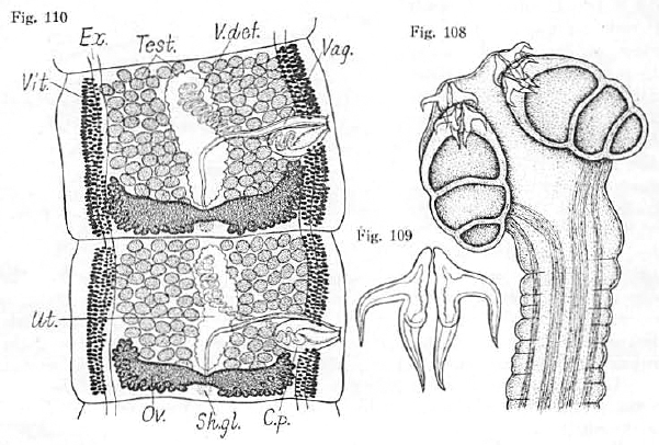 FIGURES 108-110. Acanthobothrium dasybati n. sp. 108. Scolex (0.68 x 0.87mm). 109. Bothridial hooks (0.13mm long). 110. Mature segments; ventral view (0.57 - 0.65 x 1.0mm). Abbreviations: C.p., cirrus pouch; Ex., excretory system; Ov., ovary; Sh.gl., shell gland; Test., testis; [Ut., uterus;]; Vag., vagina; V.def., vas deferens; Vit., vitellaria.