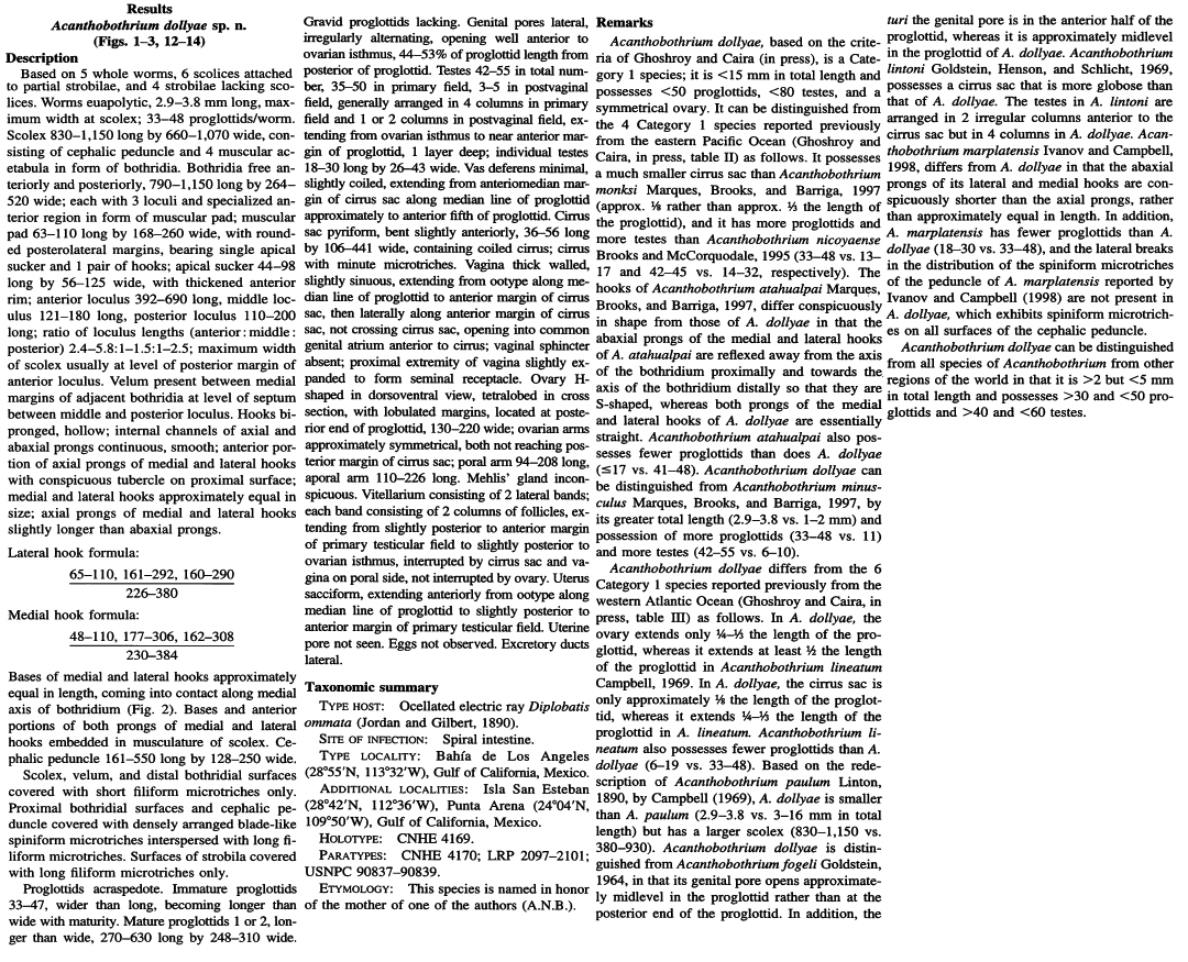 | Total Number of Type Specimens | 5 whole worms, 6 scolices attached to partial strobilae, 4 strobilae lacking scolices |
