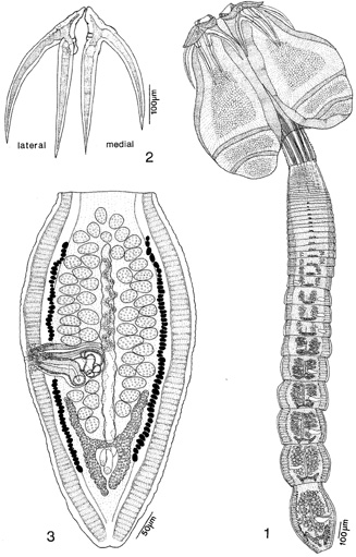 FIGURES 1-3. Acanthobothrium dollyae n. sp. 1. Whole worm. 2. Hooks. 3. Terminal mature proglottid.
