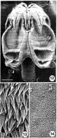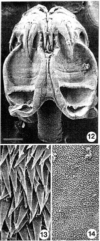 FIGURES 12-14. Acanthobothrium dollyae n. sp. 12. Scolex. Bar = 100 µm. 13. Enlarged view of proximal bothridial surface. Bar = 1 µm. 14. Enlarged view of distal bothridial surface. Bar = 1 µm.