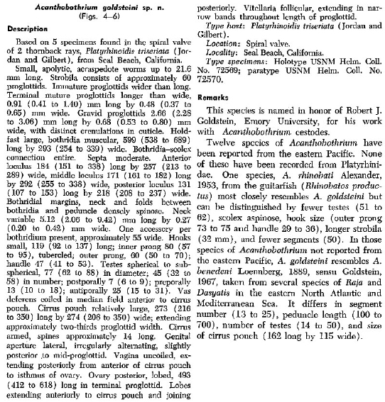 Appy, R. G. and M. D. Dailey. 1973. Two new species of Acanthobothrium (Cestoda: Tetraphyllidea) from elasmobranchs of the eastern Pacific. Journal of Parasitology 59: 817-820. (43) Download PDF |