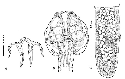 FIGURES 4-6. Acanthobothrium goldsteini n. sp. 4. Hooks. 5. Scolex. 6. Mature proglottid.