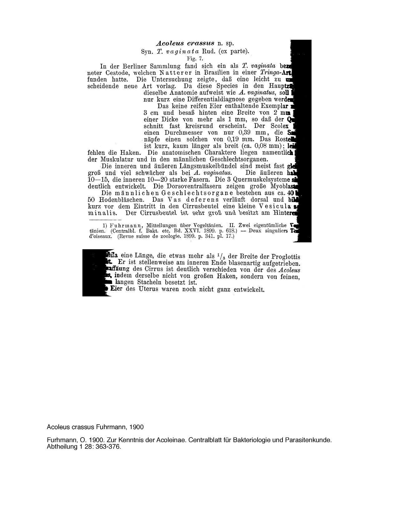 Fuhrmann, O. 1900. Zur Kenntnis der Acoleinae. Zwei getrenntgeschlechtige Cestoden. Zentralblatt für Bakteriologie, Parasitenkunde und Infektionkrankheiten. Erste Abteilung. Originale 28(12-13): 363-376. (6415) Download PDF |