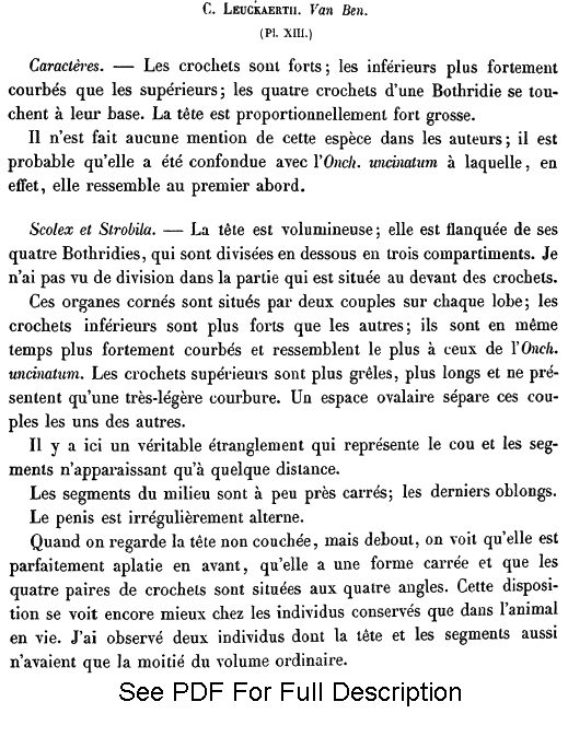 van Beneden, P.-J. 1850. Les helminthes cestoïdes, considérés sous le rapport de leurs métamorphoses, de leur composition anatomique et de leur classification, et mention de quelques espèces nouvelles de nos poissons plagiostomes. Bulletins de l’Académie Royale des Sciences, des Lettres et Beaux-Arts de Belgique 16(Part 2): 269-282.