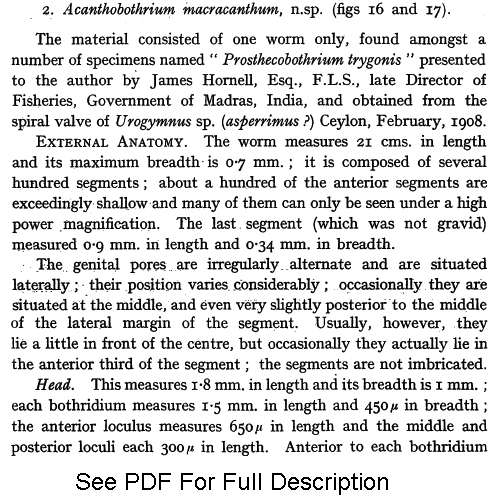 Southwell, T. 1925. A monograph on the Tetraphyllidea with notes on related cestodes. Memoirs of the Liverpool School of Tropical Medicine (New Series) 2: 1-368.