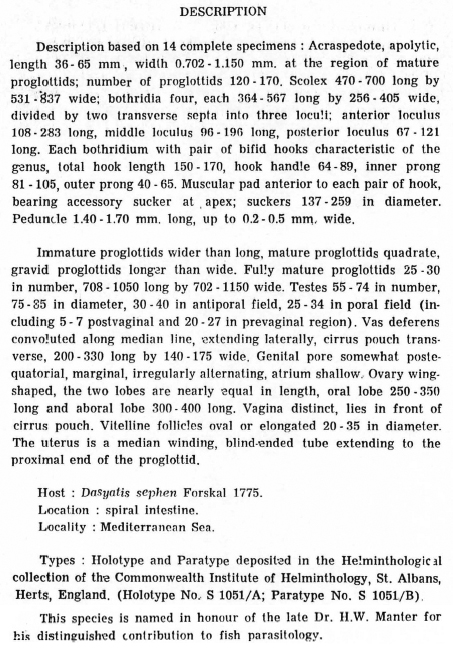 Hassan, S. H.. 1983. Acanthobothrium manteri sp. n. a tetraphyllidean cestode (Oncobothriidae) from Dasyatis sephen. Journal of the Egyptian Society of Parasitology 13: 75-80. (215) Download PDF |