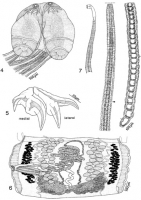FIGURES 4-7. Acanthobothrium maryanskii n. sp. 1. Scolex. 2. Hooks. 3. Mature proglottid. 7. Whole worm. Arrow indicates location of proglottid drawn in Fig. 6. Note: Because no complete worm was found, in order to provide an indication of the form of a full worm; this figure is a composit of the anterior portion of 1 worm and the posterior portion of another; the dashed line indicates the break between worm fragments.