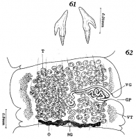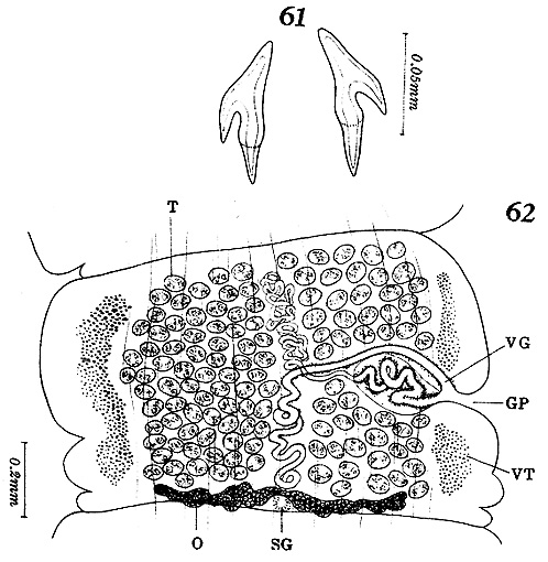 PLATE XI. FIGURES 61 & 62. Acanthobothrium micracantha n. sp. 61. Bothridial hooks. 62. Mature proglottis, dorsal view.