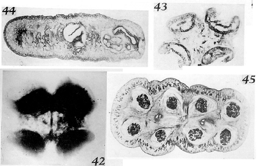 PLATE XXII. FIGURES 42-45. Acanthobothrium micracantha n. sp. 42. Scolex. 43. Transverse section of scolex, through suckers. 44. Transverse section of immature proglottis through cirrus pouch and vagina. 45. Transverse section.