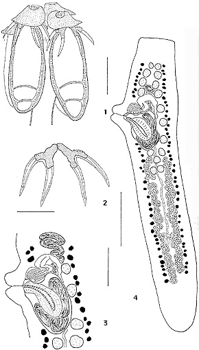 FIGURES 1-4. Acanthobothrium nicoyaense n. sp. 1. Scolex. Scale bar = 150 µm. 2. Enlargement of bothridial hooks. Scale bar = 75 µm. 3. Enlargement of terminal genitalia. Scale bar = 75 µm. 4. Terminal attached proglottis. Scale bar = 150 µm.