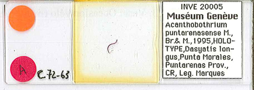 Marques, F., D. R. Brooks and S. Monks. 1995. Five new species of Acanthobothrium van Beneden, 1849 (Eucestoda: Tetraphyllidea: Onchobothriidae) in stingrays from the Gulf of Nicoya, Costa Rica. Journal of Parasitology 81(6): 942-951. (297) Download PDF |