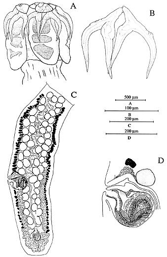 FIGURE 3. Acanthobothrium puntarenasense n. sp. A. Scolex. B. Hooks. C. Terminal proglottis. D. Genitalia.