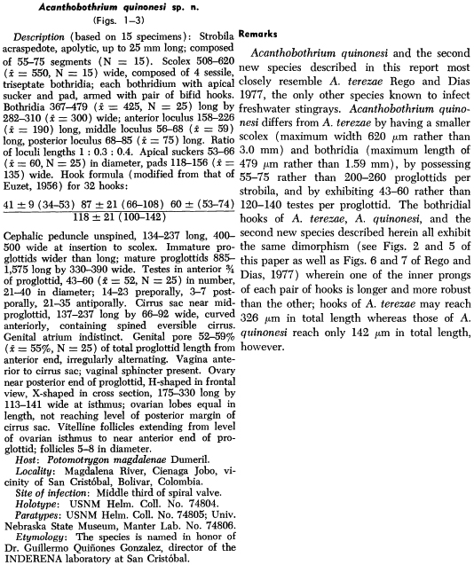Mayes, M. A., D. R. Brooks and T. B. Thorson. 1978. Two new species of Acanthobothrium van Beneden 1849 (Cestoidea: Tetraphyllidea) from freshwater stingrays in South America. Journal of Parasitology 64: 838-841.