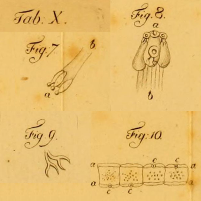 Tab. X. Figs. 7-10. Fig. 7. Taenia (Rajae Batis) a. caput lente simplici auctum. b. collum discissum. Fig. 8. Ejusdem caput instrumento pressorio et microscopio in usum voctais. Fig. 9. Ejusdem appendix alterius osculi dichotoma. Fig. 10. Ejusdem articuli quatuor medii, lente simplici aucti; a.a. canales laterales. c.c. foramina articulorum marginalia alterna.