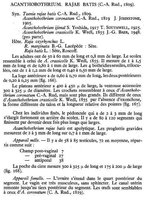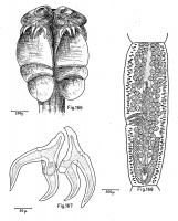 From Euzet, 1959 (Cit# 21): Acanthobothrium rajae batis (C.-A. Rud., 1809). Fig. 166. - Scolex. Vue ventrale. Fig. 167. - Crochets. Vue de face et de profil. Fig. 168. - Segment sexué. Preparation totale.