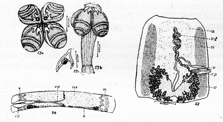 Figs. 53-55. Acanthobothrium rhynchobatidis sp. n. sub-sp. rotundum fig. 53a. Scolex, front view. fig. 53b. Scolex, lateral view. fig. 53c. Hook showing the tubercle. Fig. 54. Immature segment showing the partly atrophied testes. Fig. 55. Female mature segment. Abbreviations: c.l., cellular layer; c.p., cirrus pouch; cu., cuticle; e., egg; o., ovary; o.d., oviduct; p., proboscis; tes., testes; u., uterus; v., vagina; v.d., vas deferens; vi., vitellaria; vi.d., vitelline duct; u.d., uterine duct.