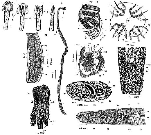 PLATE II. FIGURES 6-9. Acanthobothrium semnovesiculum n. sp. 6. Flattened scolex showing distinct suckers, muscle pads and bothridial loculi. 7. Magnified surface view of scolex indicating the arrangment of bothridial hooks (inner prong longer than outer). 8. Photomicrograph of horizontal section through the ovary; in the centre is visible the spherical egg-swallower and the oviducal bulb with thick muscular walls having large nuclei. 9. Anterior half of a posterior segment; shows the charcteristic seminal vesicle and the retracted spinose cirrus.