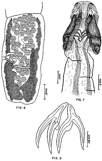 FIGURES 7-9. Acanthobothrium unilateralis n. sp. 7. Holdfast. 8. Mature proglottid. 9. Hook pair.