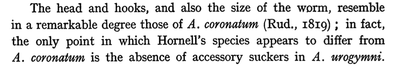 | Scientific Name Notes | Southwell (1925) appears to have been the first to use the name A. urogymni in his treatment of A. coronatum (pg.40). |