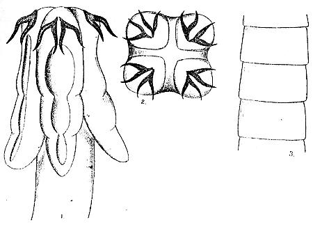 FIGURES 1-3. Prosthecobothrium urogymni n. sp. 1. Lateral view of head x50. 2. Head of the same, viewed from the anterior aspect x55. 3. Outline sketch of proglottides of the same from median region of body x40.