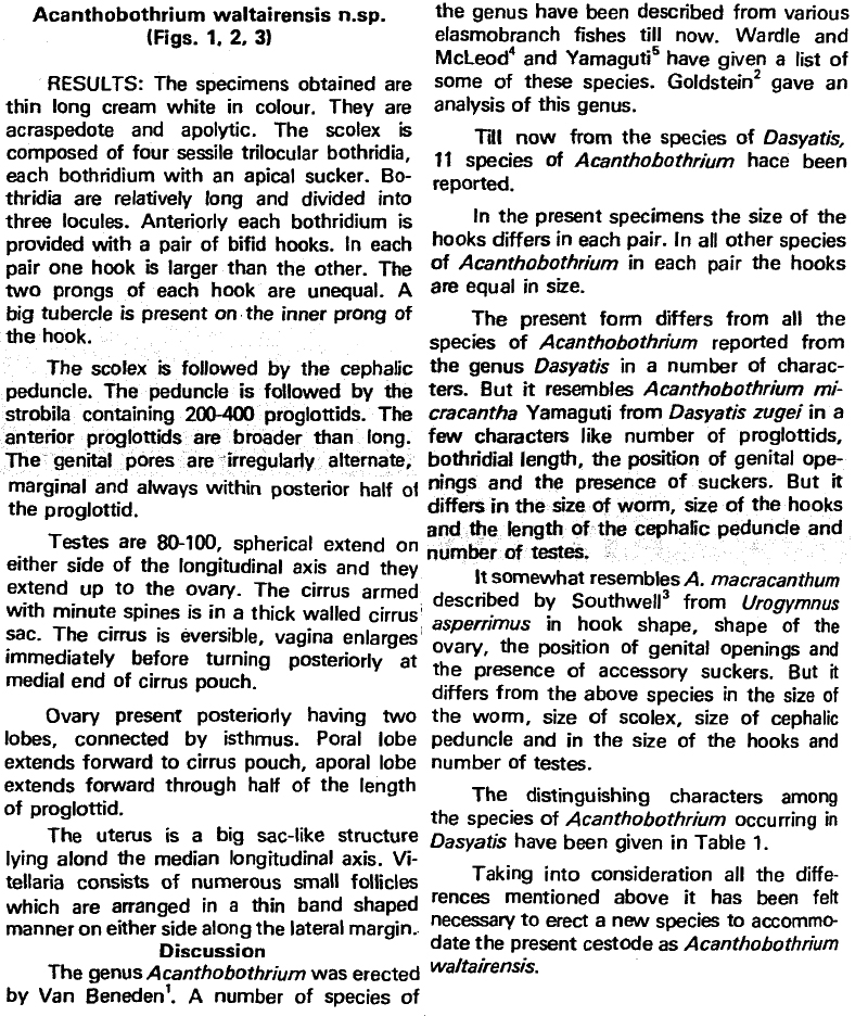 Uma Maheswari, J., S. Sanaka, C. Vijaya Lakshmi, and K. Hanumantha Rao. 1987. Acanthobothrium waltairensis n. sp. (Cestoda: Tetraphyllidea) parasite of Dasyatis uarnak (Pisces: Condrichtehyes [sic]) from India. Revista Ibérica de Parasitología 47: 33-36. (469) Download PDF |