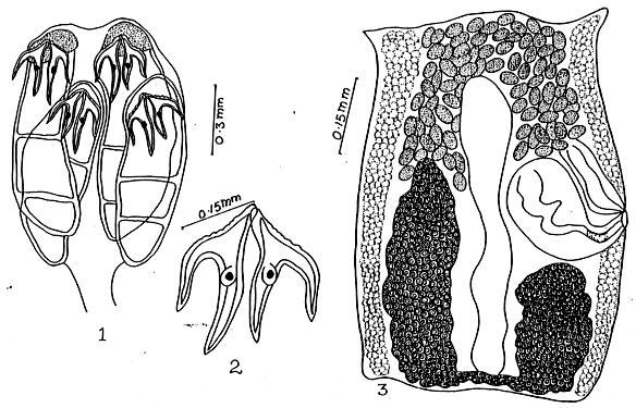 FIGURES 1-3. Acanthobothrium waltairensis n. sp. 1. Scolex. 2. Hooks enlarged. 3. Mature proglottid.
