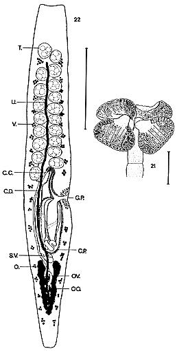 FIGURES 21 & 22. Anthobothrium amuletum n. sp. 21. Scolex (scale bar 0.2mm). 22. Segment, ventral view (scale bar 0.2mm).
