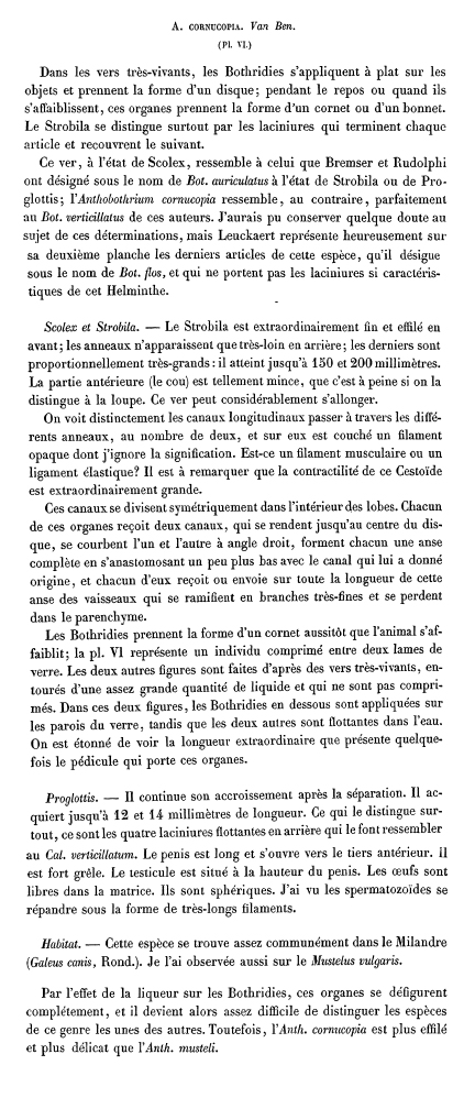 PLATE VI. FIGURES 1-13. Anthobothrium cornucopia n. sp. 1. Strobila complet et adulte, de grandeur naturelle. 2. Téte du scolex montrant les quatre bothridies d’un individu vivant, mais un peu affaibli. 3. Les premiers segments ne montrant que les lobules et les canaux ‘a l’intérier. 4. Deux segments plus avancés montrant les vésicules transparentes et le vagin. 5. Deux autres segments plus avancés encore. 6. Prglottis adulte dessiné au méme grossissement que les figures précédentes. 7. Proglottis de grandeur naturelle, tel qu’on le trouve vivant dans l’intestin. 8. Téte d’un scolex trés-vivant montrant les deux bothridies inférieures appliquées aux parois du verre. 9. La méme montrant des bothridies dans une autre position. 10. Une bothridie isolée montrant l’origine dans cet organe des conaux longitudinaux. 11. Canal longitudinal isolé avec un cordon libre. 12. Penis évacuant des spermatozoides. 13. Oeufs isolés.