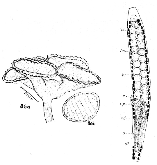 Figs. 86-87. Anthobothrium crenulatum sp. n. fig. 86a. Scolex. fig. 86a. A single bothridium of a specimen showing a faint septae. Fig. 87. Mature segment. Abbreviations: c.l., cellular layer; c.p., cirrus pouch; cu., cuticle; e., egg; o., ovary; o.d., oviduct; p., proboscis; tes., testes; u., uterus; v., vagina; v.d., vas deferens; vi., vitellaria; vi.d., vitelline duct; u.d., uterine duct.