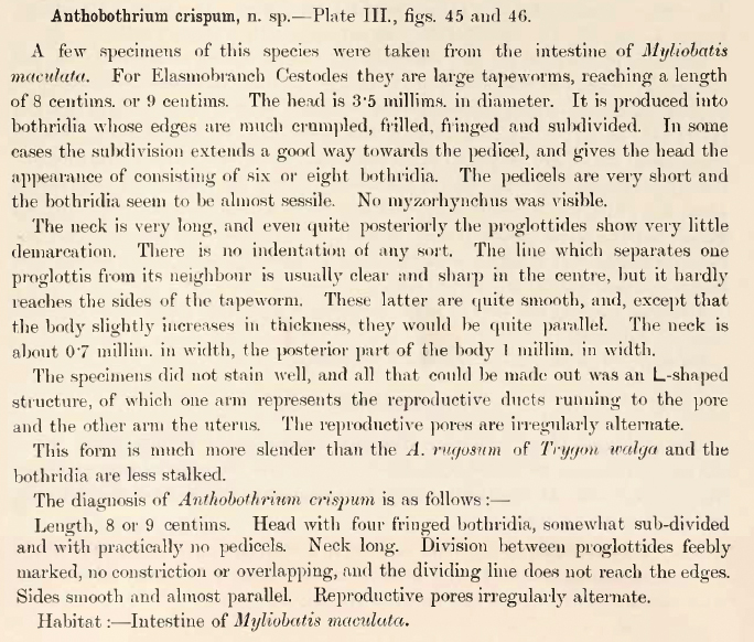 | Scientific Name Notes | Shipley (1909) suggested the replacement name A. panjadi for Anthobothrium crispum Shipley & Hornell, 1906 because the latter was preoccupied by Anthobothrium crispum Molin, 1858. A. panjadi should be considered incertae sedis (Ruhnke, 2011). |
