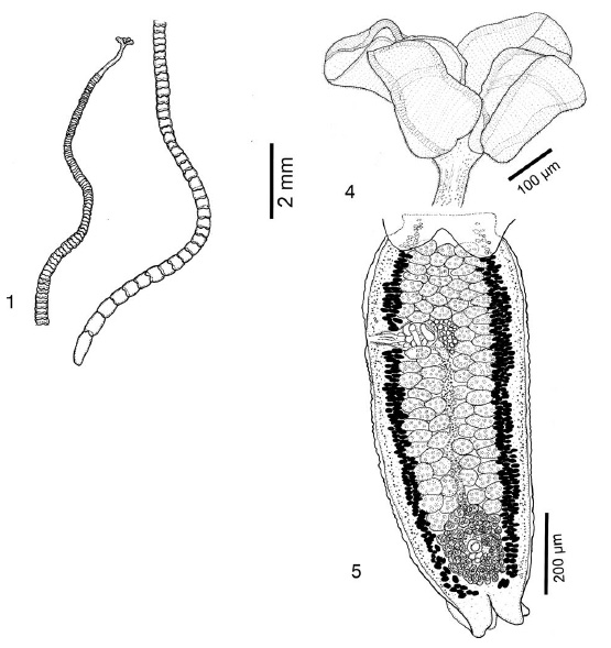 Fig. 1. Anthobothrium laciniatum, whole worm (voucher USNPC 101165). Figs. 4-5. Anthobothrium laciniatum. 4. Scolex (voucher USNPC 101165). 5. Terminal proglottid (voucher USNPC 101165).