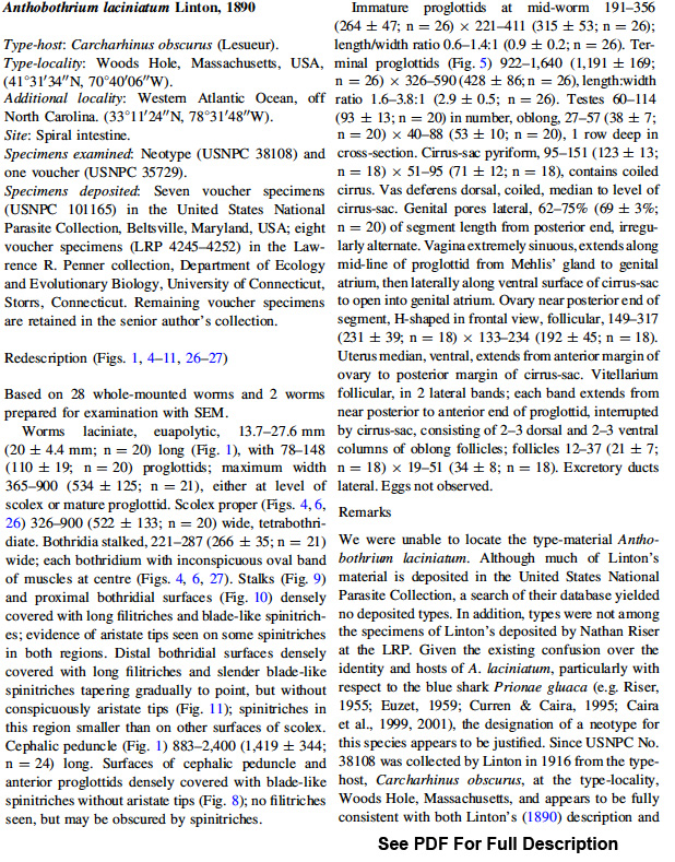 Ruhnke, T. R. and J. N. Caira. 2009. Two new species of Anthobothrium van Beneden, 1850 (Tetraphyllidea: Phyllobothriidae) from carcharhinid sharks, with a redescription of Anthobothrium laciniatum Linton, 1890. Systematic Parasitology 72: 217-227. (4503) Download PDF |