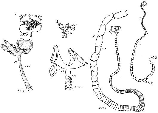 PLATE IV. FIGURES 1-3. Anthobothrium laciniatum n. sp. 1. Var. brevicolle, outline of strobile, from life, x15. 2. Head of an alcoholic specimen with the thin faces of the bothria protruding, x30. 3. Outline of strobile, from life, an occasional form, x6.
