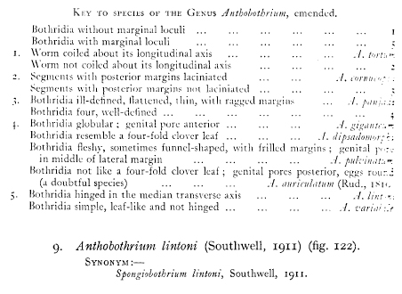 | Scientific Name Notes | Southwell (1925) synonomized Spongiobothrium Linton, 1889 with Anthobothrium Van Beneden, 1849 and thereby created the new combination Anthobothrium lintoni. (Southwell, 1912) Southwell, 1925. While this taxonomic decision was in error, the species in question, Spongiobothrium lintoni is at present incertae sedis. |
