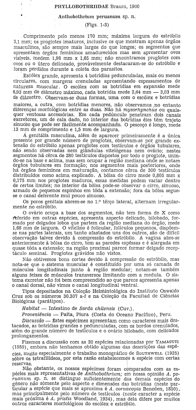 ESTAMPA I. FIGURES 1-3. Anthobothrium peruanum n. sp. 1. Escolex. 2. Proglote maduro.