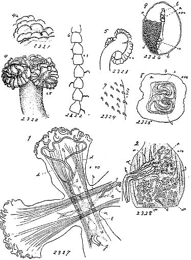 PLATE IV. FIGURES 4-9. Anthobothrium pulvinatum n. sp. 4. Head and part of neck, lateral view, from life, x8. 4a. Part of face of bothrium of alcoholic specimen. 5. View of head from behind, showing pedicels and cushion-like bothria, from life, x4. 6. Outline of posterior segments, from life, x3. 7. Spines of cirrus, from life, x about 750. 8. Transverse section at base of head, x54. 9. Transverse section a short distance back of head.