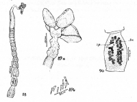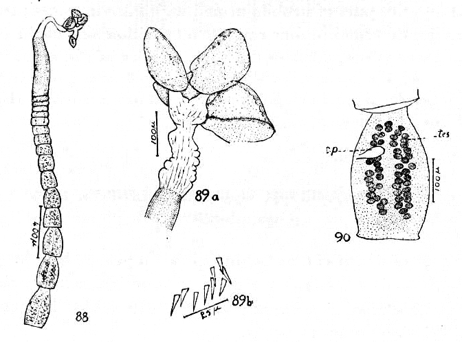 Figs. 88-90. Anthobothrium spinosum sp. n. Fig. 88. Entire specimen. fig. 89a. Scolex and neck. fig. 89b. Spines on scolex. fig. 90. Immature segment showing the testes. Abbreviations: c.p., cirrus pouch; tes., testes.