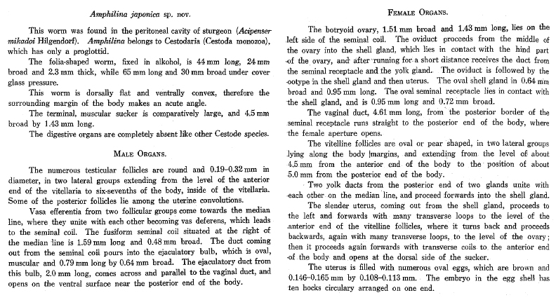 Goto, S. and N. Ishii. 1936. On a new cestode species, Amphilina japonica. Japanese Journal of Experimental Medicine 14: 81-83. (3) Download PDF |