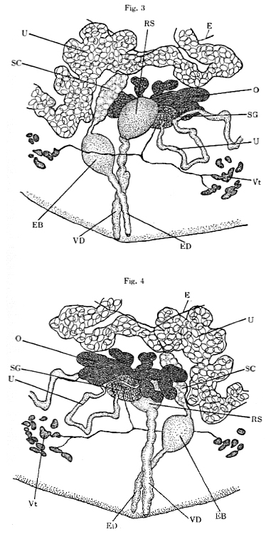 Plate IX. Fig. 3. Genital complex of A. japonica; ventral view (from study of sections). Fig. 4. Genital complex of A. japonica; dorsal view (from study of sections). Abbreviations used in Figures. U=uterus, SC=seminal coil, EB=ejaculatory bulb, Vt=vitellarium, O=ovary, ED=ejaculatory duct, VD=vaginal duct, RS=seminal receptacle, SG=shell gland, E=vas eferens.