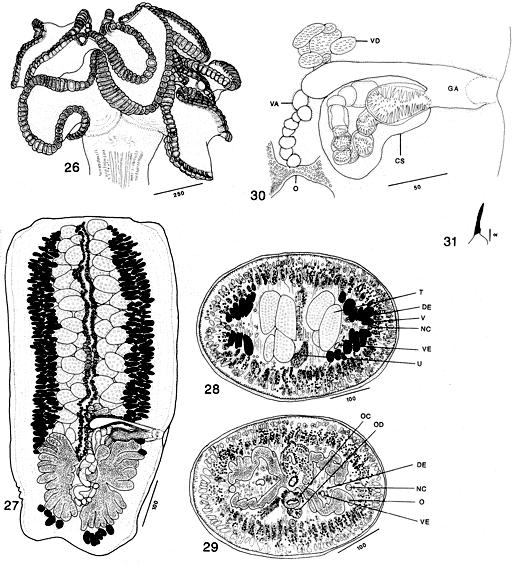 FIGURES 26-31. Anthocephalum cairae n. sp. 26. Scolex of holotype USNPC No. 83435. 27. Mature segment of paratype USNPC No. 83436. 28. Cross-section through segment anterior to cirrus-sac and of paratype HWML No. 37094. 29. Cross-section through segment at ovary of paratype HWML No. 37094. 30. Details of terminal genitalia. 31. Cirrus microthrix of paratype HWML No. 37094.