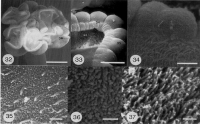 FIGURES 32-37. Anthocephalum cairae n. sp. 32. Scolex (number indicates region of scolex illustrated in Fig. 36). 33. Enlarged view of marginal loculi (numbers indicate region of scolex illustrated Figs. 34 and 35). 34. Enlarged view of proximal bothridal surface, at periphery of a marginal loculus. 35. Enlarged view of proximal bothridal surface, posterior to periphery of loculus. 36. Enlarged view of proximal bothridial surface, on body of bothridium. 37. Enlarged view of distal botridial surface. Scale bars: 32, 200µm. 33, 20µm. 34, 2µm. 35, 37, 1µm. 36, 500nm.