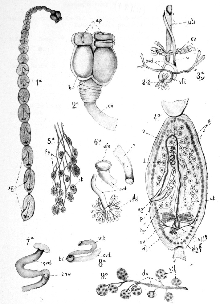 Fig. 1. - Aspetto generale dell'Aocobothrium Carruci: da un esemplare conservato in alcool x 3 circa. 2. Scolice dello stesso, molto ingrandito e compresso, da una preparazione in toto x 20 circa. 3. Figura schematica, da una preparazione in toto e da sezioni in serie sagittali e trasversali, per dimostrare i rapporti reciproci degli organi genitali femminili. 4. Una proglottide delle ultime della catena, vista dal dorso: da una preparazione in toto per compressione molto ingrandita x 20. 5. Sezione frontale di prolottide che mette in evidenza l'originarsi degli efferenti dai testicoli x 150. 6. Sezione frontale di proglottide che lascia vedere l' originarsi dell'ovidotto, la vagina, le glandole del guscio che involgono l'ovidotto e la porzione ascendente di questi. x 500. 7. Sezione fontale di proglottide, che mostra il decorso del-l'ovidotto dal suo inizio e lo sbocco della vagina. x 500. 8. Sezione fontale di proglottide dove si scorge il vitellodotto impari come sbocca nell'ovidotto. x 500. 9. Sezione frontale di proglottide che mostra l'originarsi degli efferenti vitellodutti dagle acini vitellini. x 500.