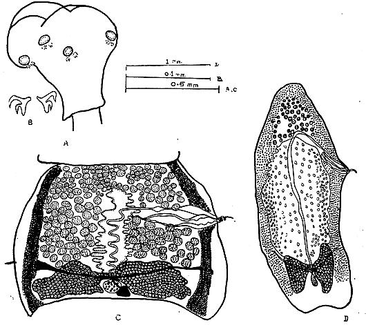 FIGURES A-D. Balanobothrium aurangabadensis n. sp. A. Scolex. B. Hooks. C. Mature segments. D. Gravid segments