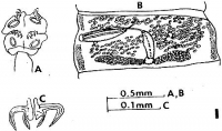 FIGURE 1. Balanobothrium somnathai n. sp. A. Scolex. B. Mature segment. C. Hooks.