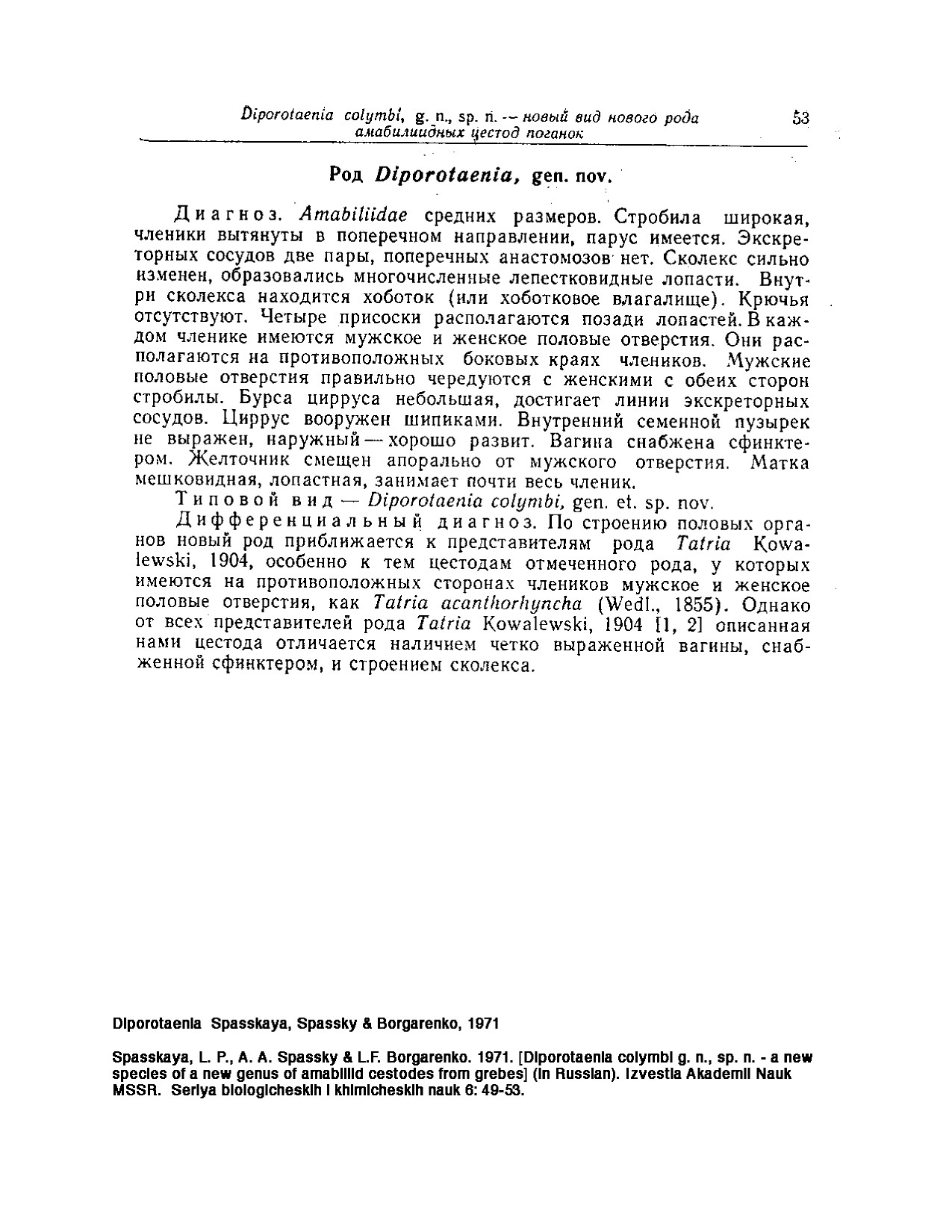 Spasskaya, L.P., A.A. Spasskii, and L.F. Borgarenko. 1971. Diporotaenia colymbi g. n., sp. n. -- new species of new genus of amabiliid cestodes of grebes. Izvest. Akad. Nauk Moldavsk. SSR, ser. Biol. i Khim. Nauk 6: 49-53.