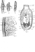 TEXT FIGURES 1-3. Biporophyllaeus madrassensis. n. sp. 1. a, b and c. Unmounted specimens. 2. Structure of body wall. 3. Diagramatic representation of the deposition of the various glands and du... MoreTEXT FIGURES 1-3. Biporophyllaeus madrassensis. n. sp. 1. a, b and c. Unmounted specimens. 2. Structure of body wall. 3. Diagramatic representation of the deposition of the various glands and ducts as viewed from the ventral side. Explanation of lettering: a. n. r., anterior nerve ring; b., bay; cu., cuticle; c. c., calcareous corpuscles; c. m., circular muscles; c. s., cirrus sac; e. d., excretory duct; e. v., excretory vesicle; f. c., fertilization chamber; fl. c., flame cell; g. a., gential atrium; g. c., gland cells; l. m., longitudinal chamber; fl. c., l. m. c., longitudinal muscle cells in probiscus; n., neck; n. c., nerve cord; n. g., posterior nerve ganglion; o. f., funnel of the oviduct; otp., ootype; ov., ovary; p., penis; pr., probiscis; p. n. r., posterior nerve ring; pr. n. r., probiscus nerve ring; s. c. l., subcuticular layer; s. d., duct of the shell gland; s. g., shell gland; sp., spinelets on the probiscus; tr., trunck; t. v., testicular vesicles; u., uterus; u. op., uterine opening; v., vagina; v. d., vas deferens; v. ev., valves of the excretory vesicle; v. f., valves of the oviducal funnel; v. g., vitelline glands; x., opening of uterus and vagina into the ootype. |