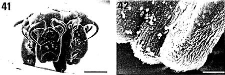 FIGURES 41 & 42. Calliobothrium creeveyae n. sp. 41. Scolex. 42. Posterior margin of bothridium, note 3 lobes and blade-like projections on posterior surface. Scale bars: 41. 100mm. 42. 10µm.