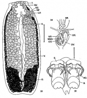 FIGURES 32-34. Calliobothrium creeveyae n. sp. 32. Scolex, scale bar = 0.1mm. 33. Mature segment, ventral view, scale bar = 0.2mm. 34. Female reproductive system, ventral view, scale bar = 0.1mm.
