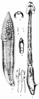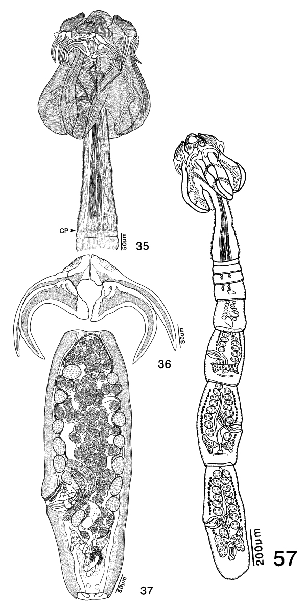 FIGURES 35 -37. Calliobothrium eschrichti. 35. Scolex. 36. Detail of hooks showing articulation of axial and abaxial hooks. 37. Gravid segment.